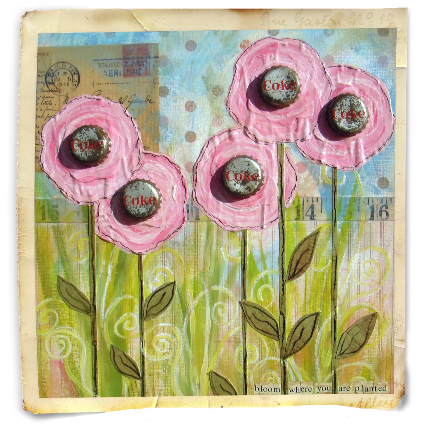 I was originally going to do something different with the flowers but I remembered that I purchased a bunch of vintage pop bottle caps the other week and I ended up re-working the flowers so that I could add the bottle caps. I'm pretty happy with the way that the collage worked out.